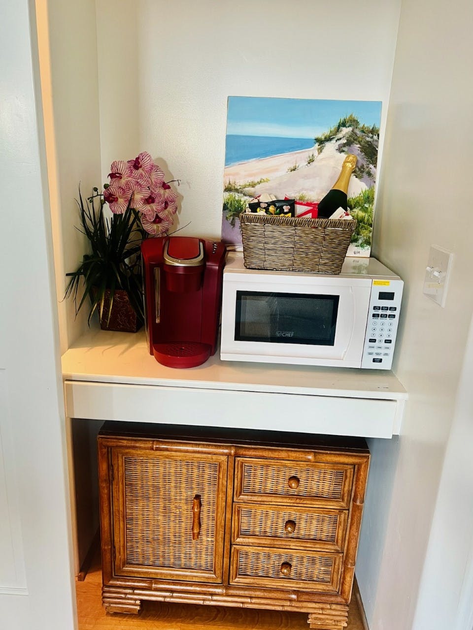 Both rooms comes with a fireplace, there's also a microwave, Keurig coffee machine and a mini fridge available.
